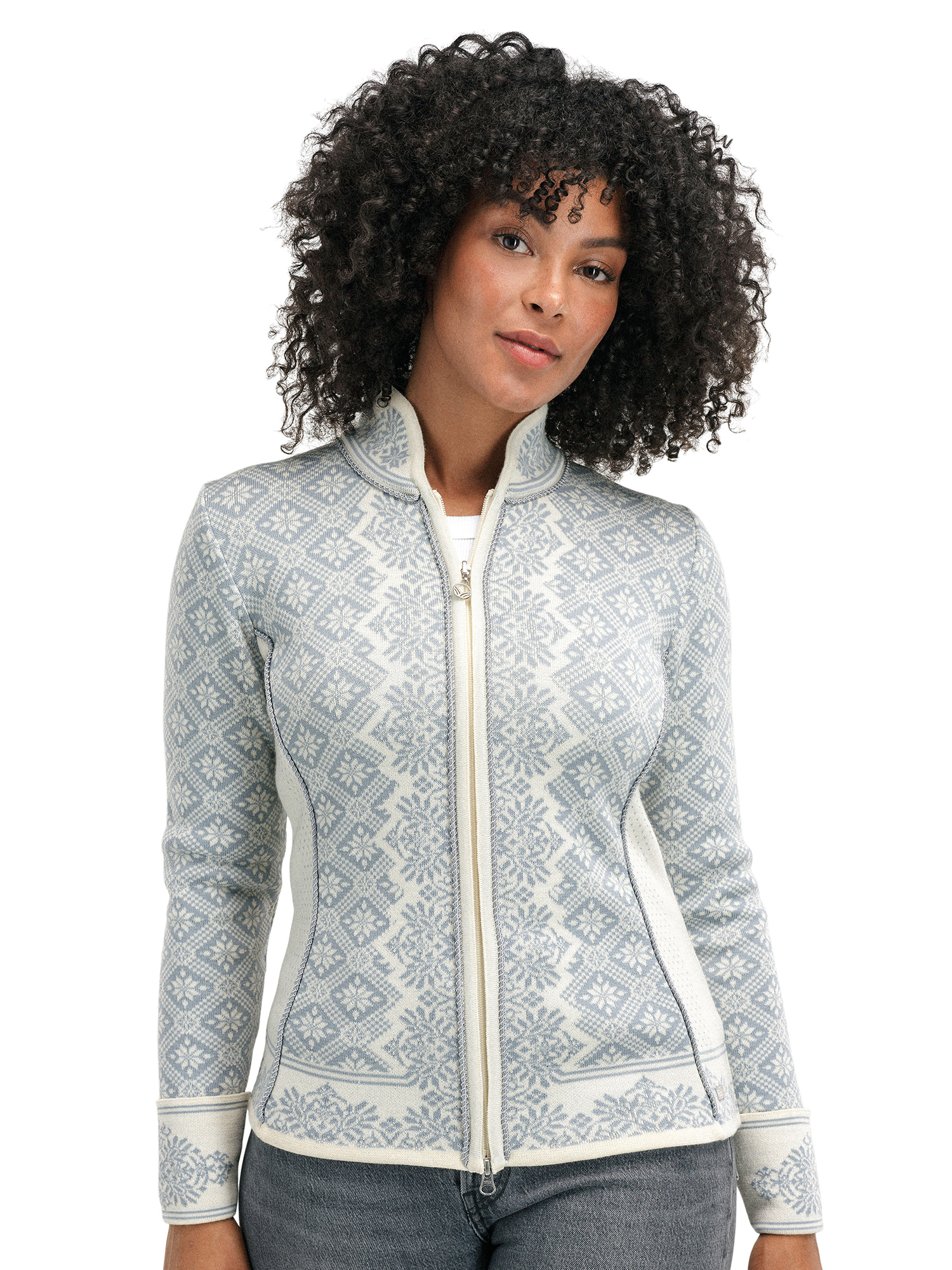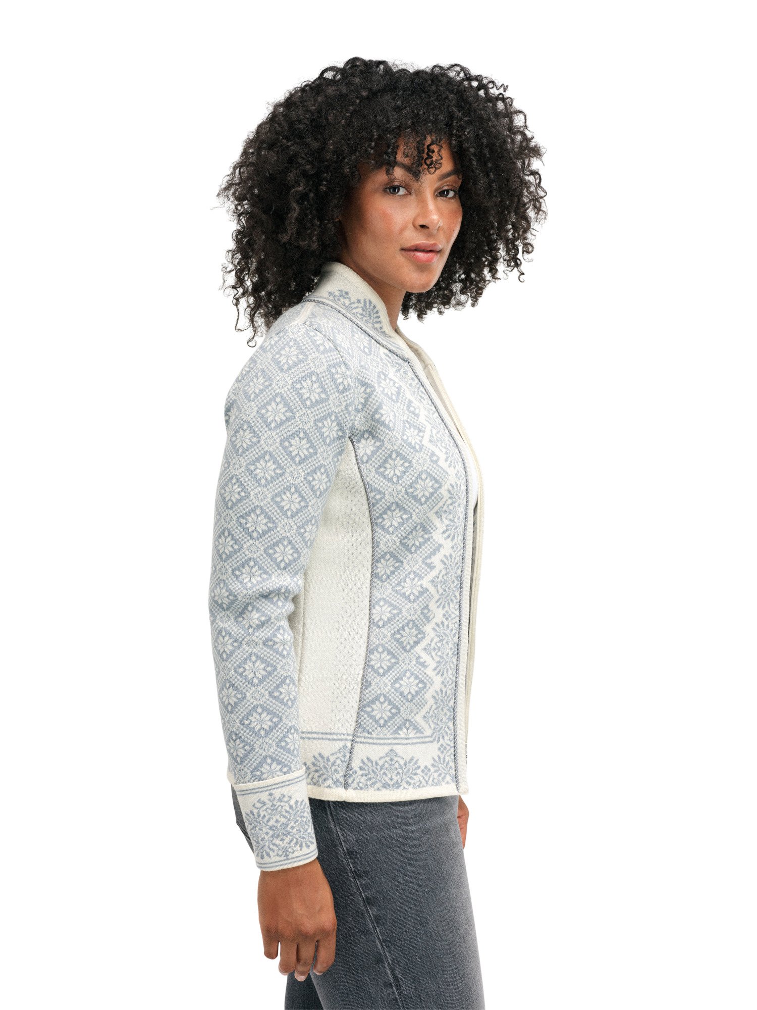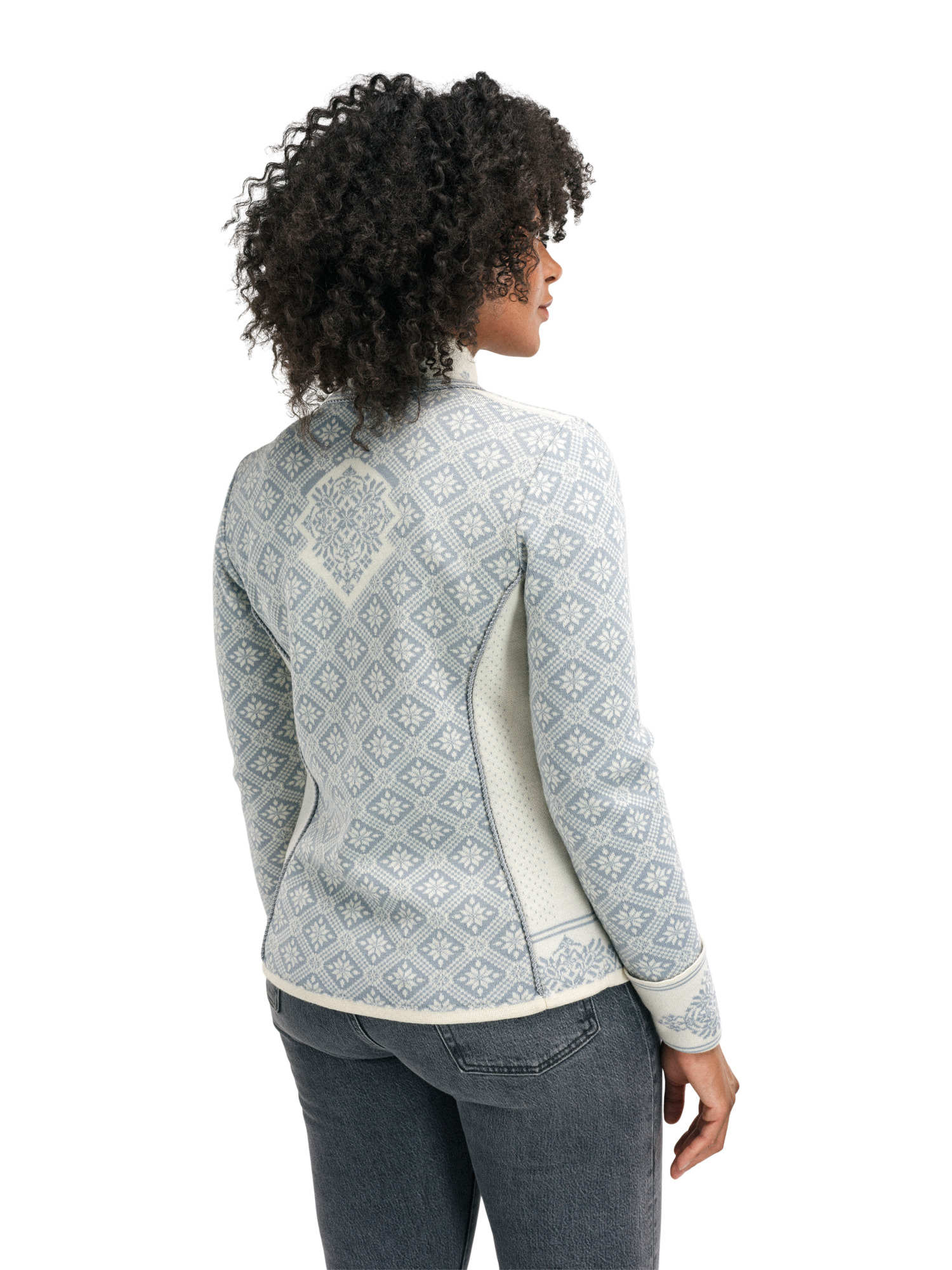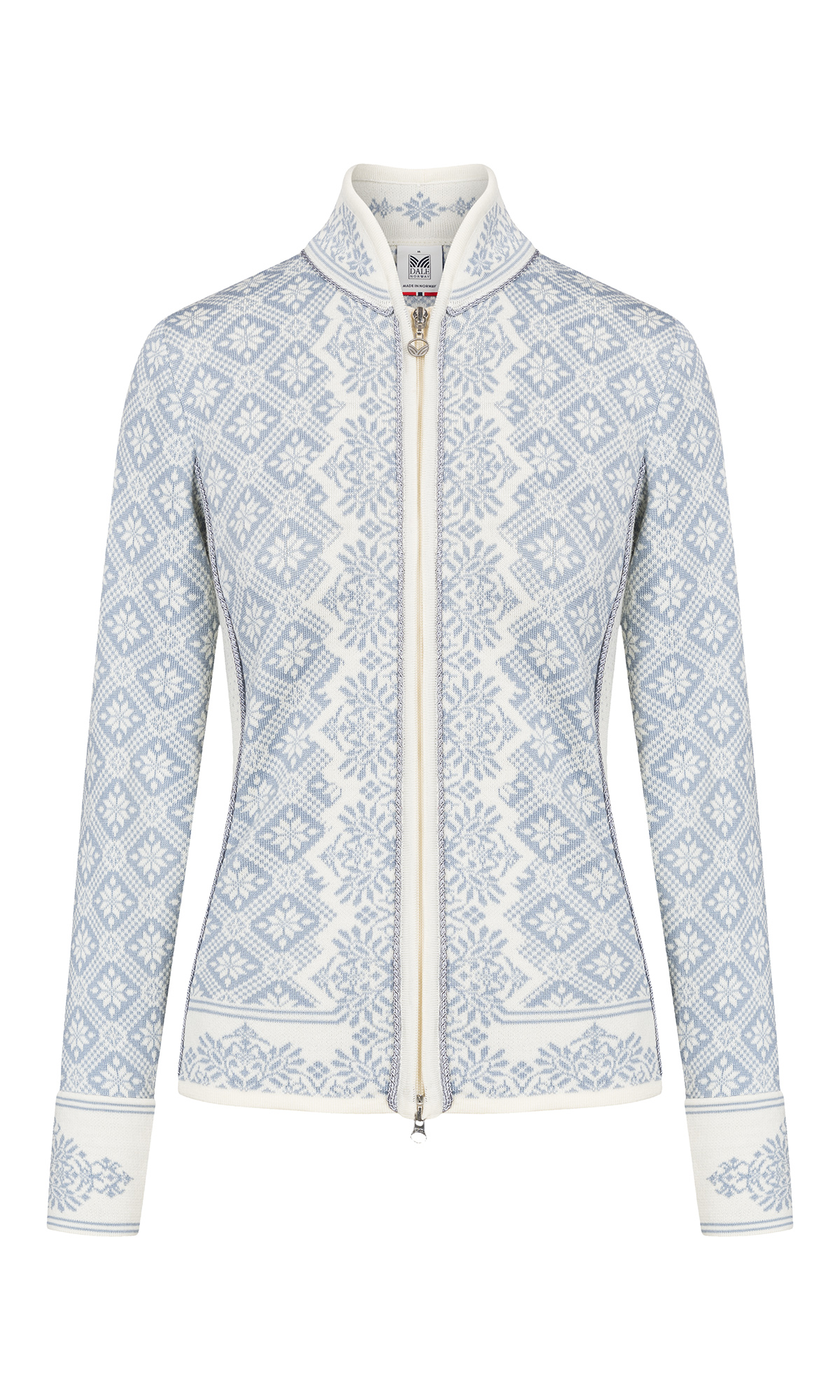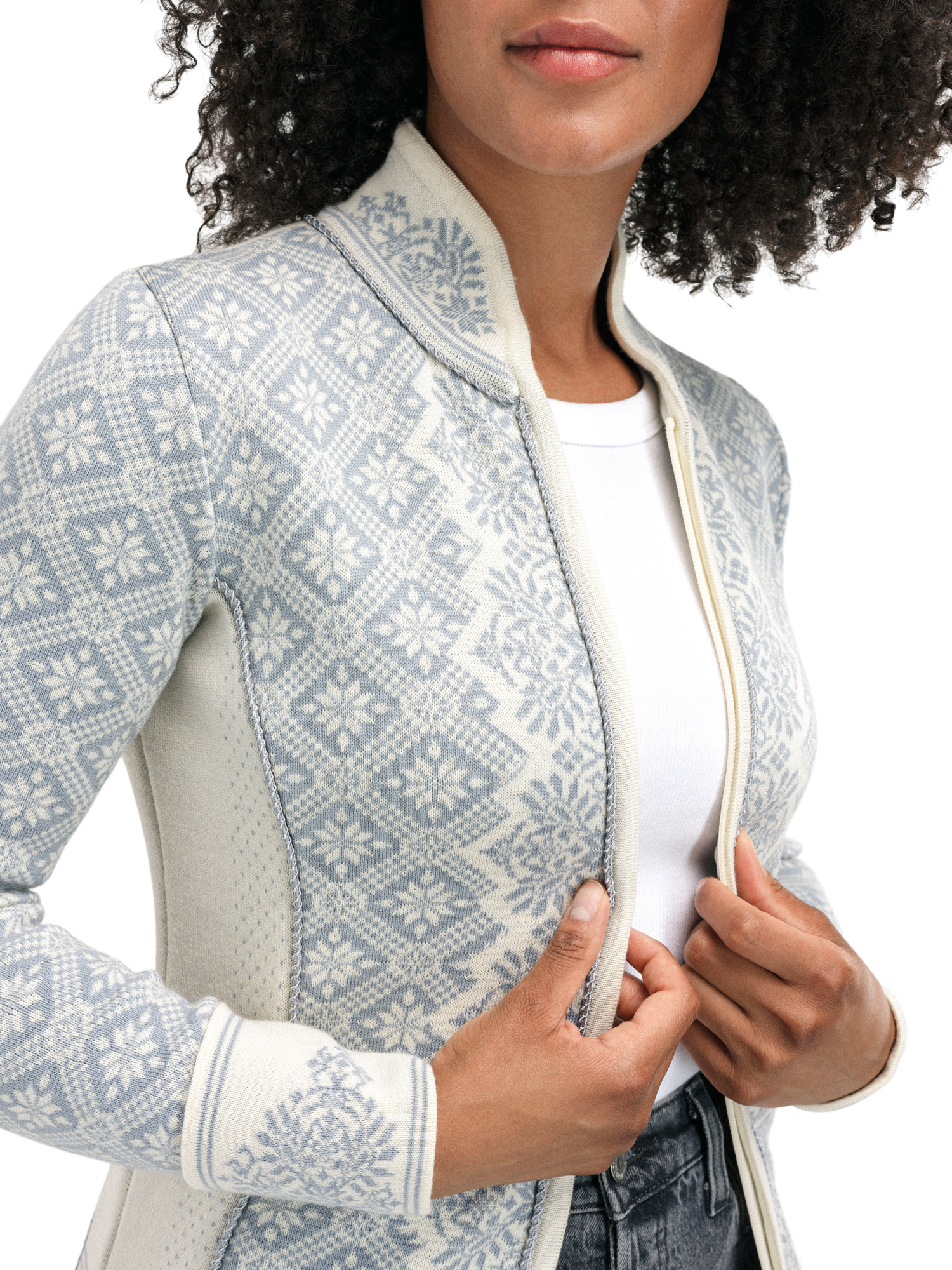 A skin soft merino wool cardigan influenced by the fashion trends of the early 20th century. Featuring Norwegian patterns, decorative roll-up cuff and flattering side panels – a nod to the corset shape.