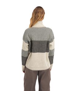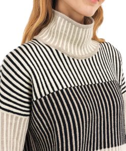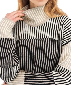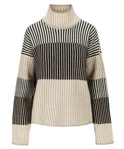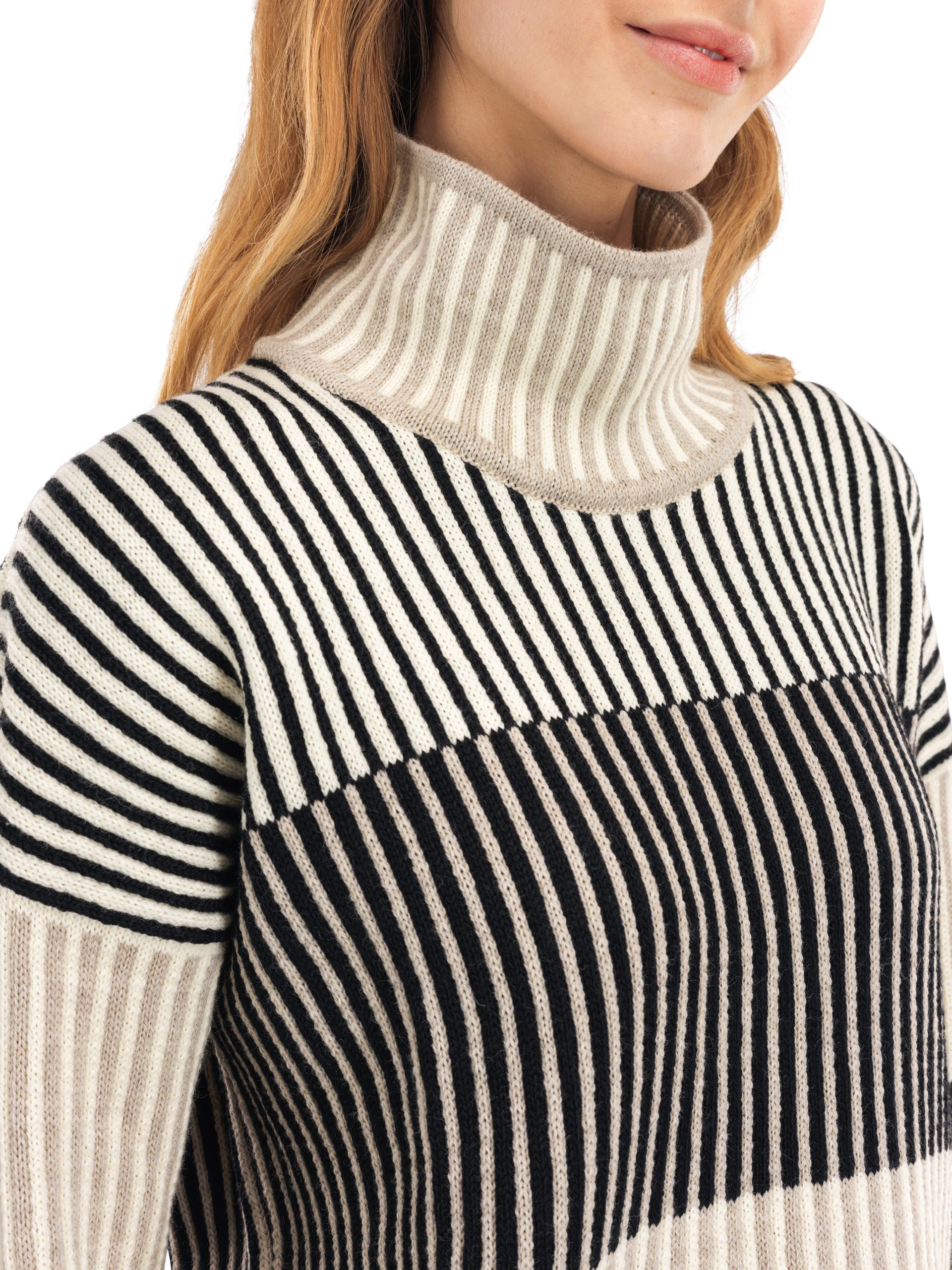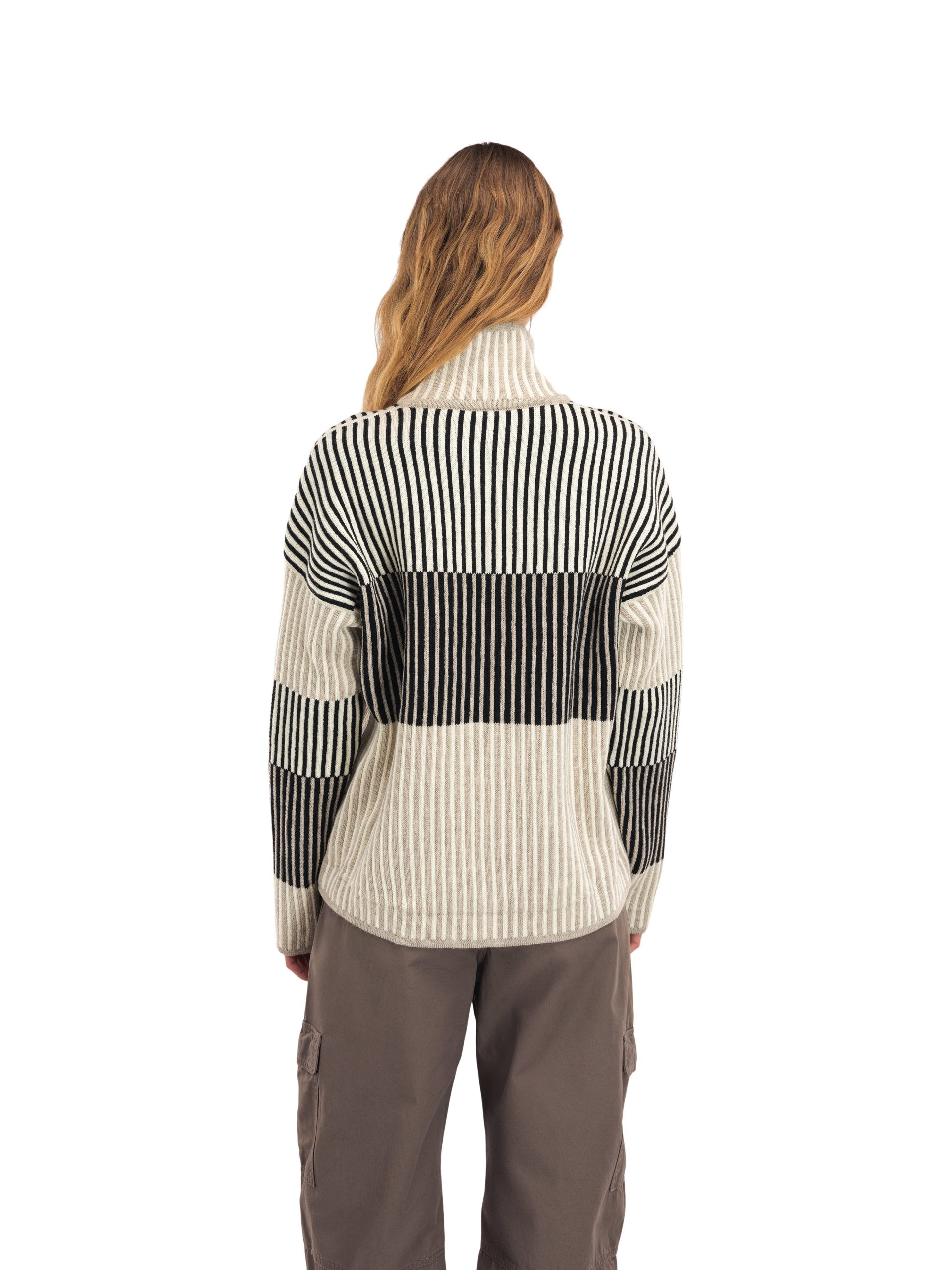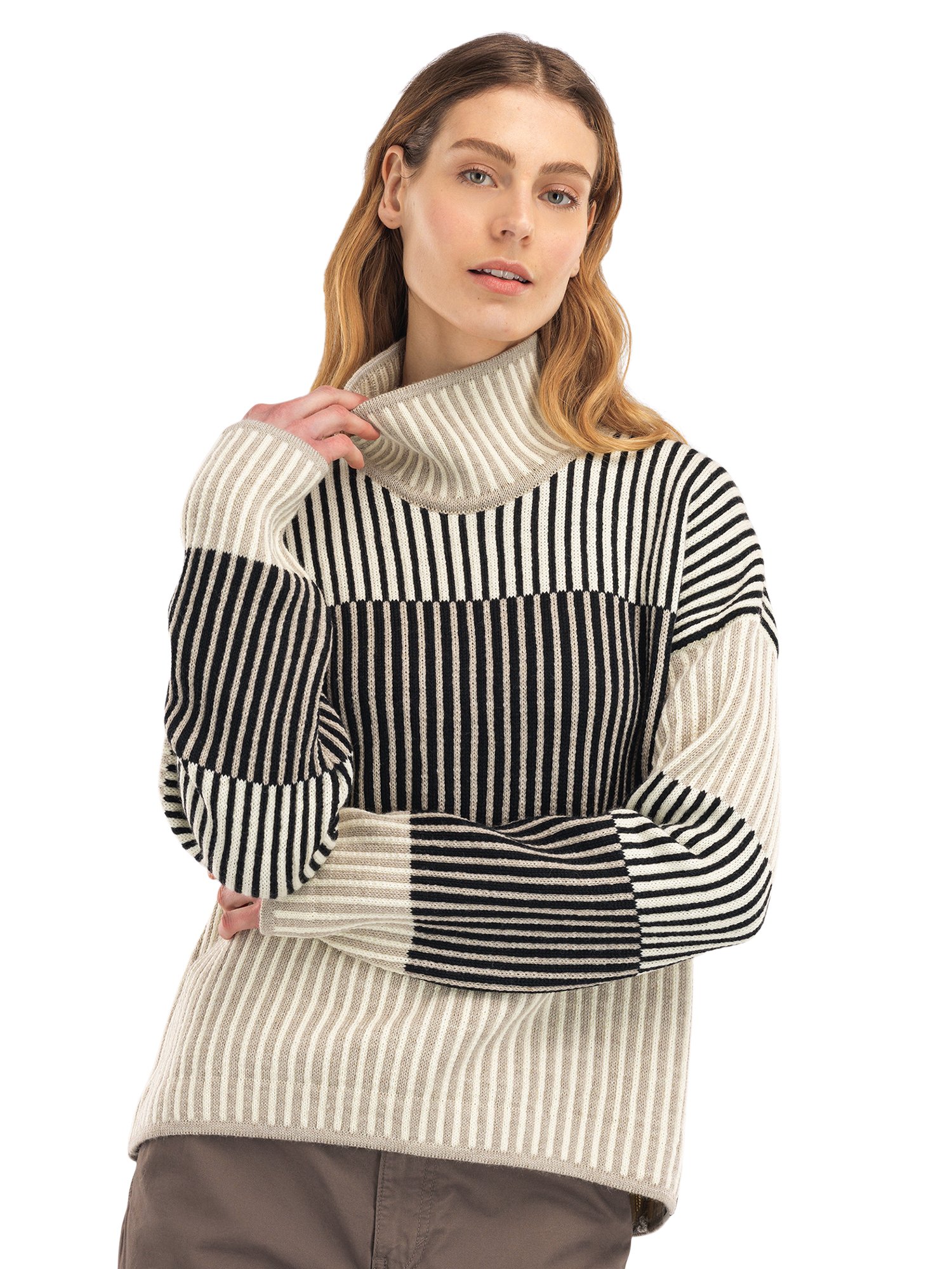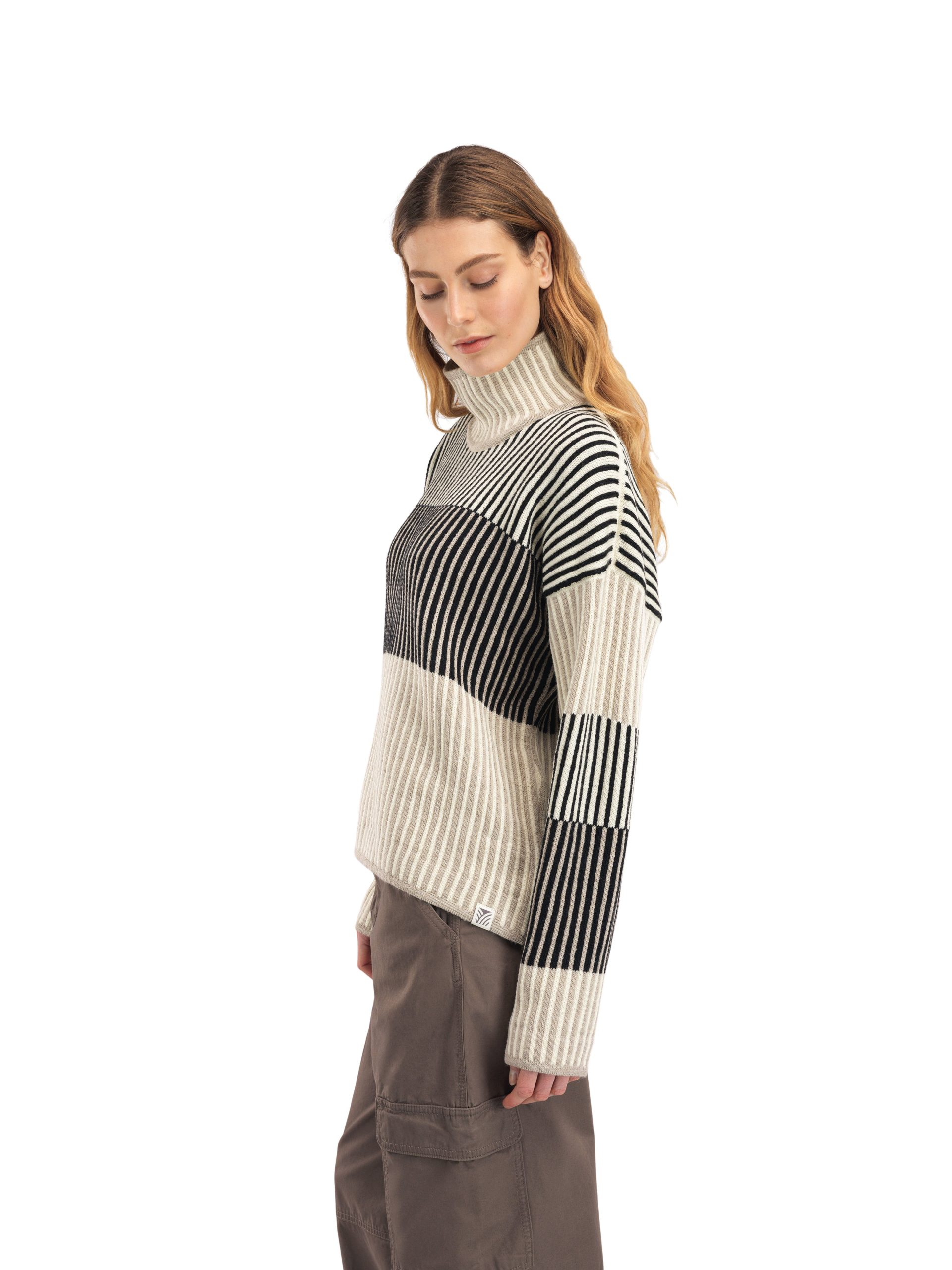 A playful sweater with a relaxed, dropped shoulder giving a wide fit. The sweater is knitted in a tonal palette and a structured effect giving a rib look-a-like. Despite the split look, the front, back and sleeves of the sweater are knitted as whole pieces. The high neck is single knitted with a wide shape for comfort and room.